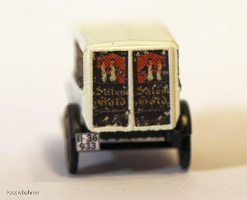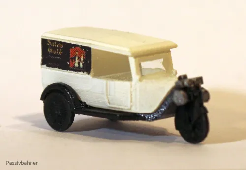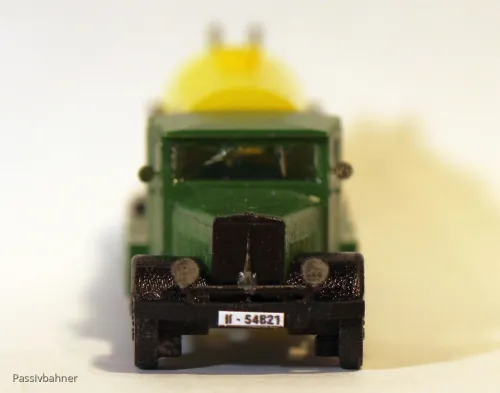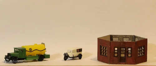 Die Vorlage habe ich in OpenSCAD gemacht, gedruckt wurde bei Shapeways. Auf Christians altem Bild ist zu erkennen, dass die Tankstelle mal zur Ölfirma Nitag gehört hat. Bei Wikipedia fand ich einen kleinen Hinweis zum Farbschema, ansonsten konnte ich farbige Bilder nur von Modellen finden: https://de.wikipedia.org/wiki/NITAG Für das Logo habe ich mir dann entsprechende Decals selbst angefertigt. Kennzeichen hat das Fahrzeug ebenfalls bekommen, nach meiner Recherche müssten die für Dresden in der ersten Hälfte der 30er Jahre korrekt sein.