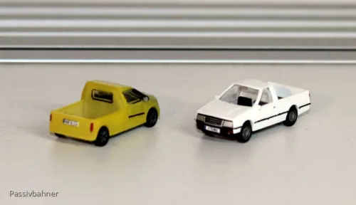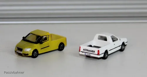 Der Auhagen Pick-up ist ja bekannt, ich habe ihm nur ein paar kleine Details verpasst, und als Gag bekam er den bei vielen kleineren Pickups an der Heckklappe zu findenden Markennamen. Der kleine Gelbe ist ein Freelance-Spaß, der aus einer Bierlaune entstanden ist. exiswelt meinte, ich müsste aus dem Roomster mal einen Pickup machen. Für einen ernstzunehmenden Lastesel ist er natürlich viel zu kurz, und die Zuladung wäre sicher auch nicht so doll, also habe ich ihn gelb gemacht, um ein wenig an den alten Skoda Skoda Felicia Fun Pickup zu erinnern.