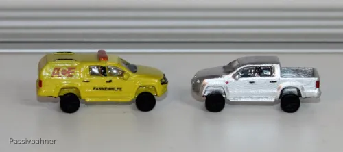 Und zu guter Letzt hier noch zwei Drucke von Robert Hasse. Das sind VW Amarok, einmal als normale Doppelkabine mit Pritsche, einmal als Einsatzfahrzeug. Bei mir wurde daraus ein Pannenhilfsfahrzeug, und ich habe beide etwas extremer hochgelegt, um maximale Geländegängigkeit anzudeuten.