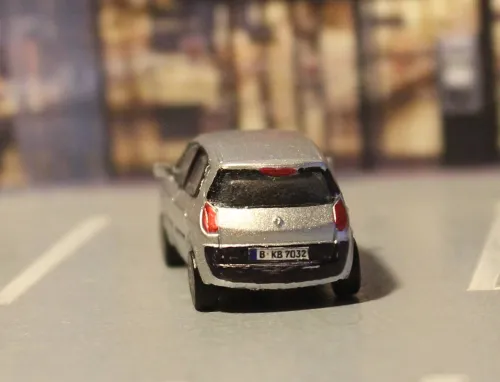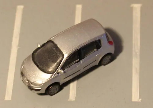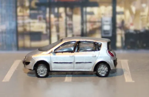 Ein Freund musste wegen einiger irreparabler Schäden seinen geliebten Renault Scenic zum Verwerter geben. Zum Glück gibt es jetzt ein Modell des Scenic vom Panzer-Shop.nl , und so konnte ich einen Scenic in einer der Originalfarbe angenäherten Farbe lackieren, und das exakte Kennzeichen hat er auch bekommen. Die üblichen Mängel sind vorhanden, ich habe die Details nicht gerade druckscharf mit Eddings aufgemalt, und die Scheiben sind aus MKK, wobei Front- und Heckscheibe ein wenig stumpf geworden sind, da ich die Wölbungen und vor allem die extreme Größe der Frontscheibe nur mit dem textilen Maskiertape von Tamiya hinbekommen habe.