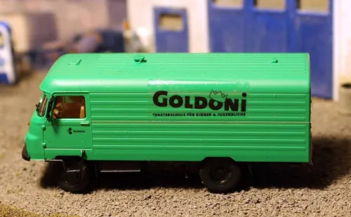 Außerdem habe ich den Robur von Auhagen/ mini car gebaut, und da ich nun einmal die Epoche 6 bevorzuge, hat er Euro-Kennzeichen und die Beschriftung einer Theaterschule für Kinder und Jugendliche bekommen. Die Schule gibt es wirklich, aber ich bezweifele, dass sie einen Robur als Transporter haben. Andererseits ist es garnicht so selten, dass Kultureinrichtungen sehr alte Transporter oder LKW haben, da für Neues das Geld nicht reicht und andererseits das Besondere und richtig Alte dem Gebrauchtwagen vorgezogen wird. Mir ist dann noch ein Scheibenwischer von der Pinzette gesprungen. In den M25-Bausätzen waren noch die Scheibenwischer des M24, allerdings sind die nach der falschen Seite ausgerichtet, so dass die beiden Wischerarme jetzt nicht symmetrisch sind.