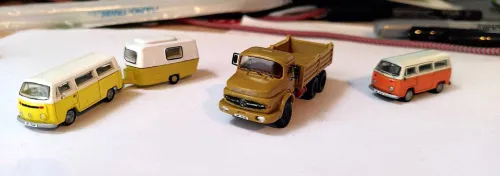 Tief im Westen wohnt einer, der sich mit der Hersfelder Kreisbahn in TT befasst, und zwar zu Zeiten der Epoche IV. Für den habe ich da mal was aus zugelaufenen 3D-Drucken gebastelt bzw. einen Gabor-Mercedes-Rundhauber-Kipper ein bisschen aufgehübscht mit kleinen farblichen Akzenten, Kennzeichen und Rückspiegeln: