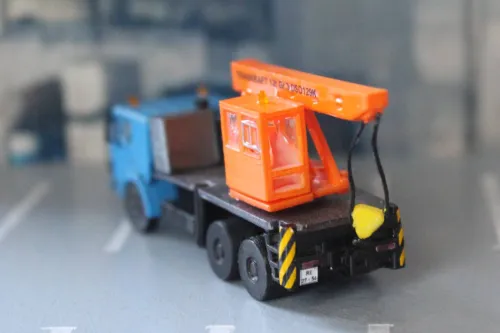 Nun hatte ich aber noch recht viele Teile da und ein zweites Fahrzeug auch mal begonnen. Und so habe ich den jetzt, krumm und buckelig, wie er nun einmal werden musste, fertiggestellt. Offenbar hatte er mal einen kleinen Unfall, da sich das Krandeck im vorderen Teil nach vorn neigt, aber das Fahrgestell hat nichts abbekommen. Wie man am Kennzeichen sieht, ist er in Dresden zuhause, und zu einem dortigen Straßenbahnbetrieb wird das Fahrzeug zeitnah überführt.