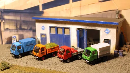 Inzwischen gibt es, wenn ich mich nicht verzählt habe, schon vier Varianten des Multicar M25 von Auhagen. Da ich diesen Multicar sehr mag und er aufgrund seiner großen Produktionszahlen und seines praktischen Nutzens heute noch nicht selten in produktiven Rollen anzutreffen ist, wollte ich unbedingt alle vier Varianten haben, allerdings mit dem Plan, alle in die Epoche VI zu verpflanzen. Das bedeutete in allen Fällen Euro-Kennzeichen, in zwei Fällen auch Neulackierung. Das Messemodell mit der Plasticart-Werbung durfte sein Aussehen behalten, bekam aber H-Kennzeichen und noch die Rückspiegel, die dem Modell beilagen. Der Kipper mit den Propangasflaschen blieb weitgehend unverändert, aber die Minol-Werbung musste weg und wurde durch Westfalen-Werbung ersetzt, eine neuzeitliche Firma, die auch ein rotes Farbschema hat und mit Propangas handelt. Der Werkstattwagen durfte Werkstattwagen bleiben, ist jetzt aber blau, damit er zu den Bussen meines fiktiven Nahverkehrsunternehmens passt. Decals hat er auch spendiert bekommen, um Firmenzugehörigkeit zu zeigen. Der Hochbordkipper ist jetzt nicht mehr für den Kohlenhandel tätig. In Orange und bis über die Oberkante mit Grünschnitt beladen, gehört er jetzt zu den Stadtwerken Middelstedt und hilft bei der Pflege von Parkanlagen.