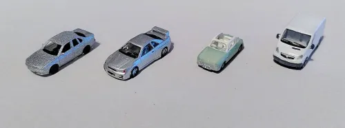 Ich benutze ausschließlich Autolacke der "großen" Autos. Dieses konkrete Silber enthält Partikel, die wie Prismen wirken und einen Glitzereffekt erzeugen. Das sieht bei entsprechender Beleuchtung ganz hübsch aus. Der Nachteil ist, dass es keine glatte Oberfläche gibt. Bei echten Autos muss man da vermutlich mit Politur ran. Beim GT-R ist es da jetzt zu spät, aber bei normaler Entfernung stört das nicht sehr, beim Primera ist ja noch keinerlei Detailierung erfolgt, und die Scheiben sind auch noch nicht drin. Ich werde mal erforschen, in welcher Weise ich dem eine Politur verpassen kann. Ansonsten habe ich auch andere silberne Lacke, die eine glatte Oberfläche erzeugen, aber denen fehlt eben der Glitzer - und bei den alten Japanern in Liebhaberhand ist eben mehr Lametta.