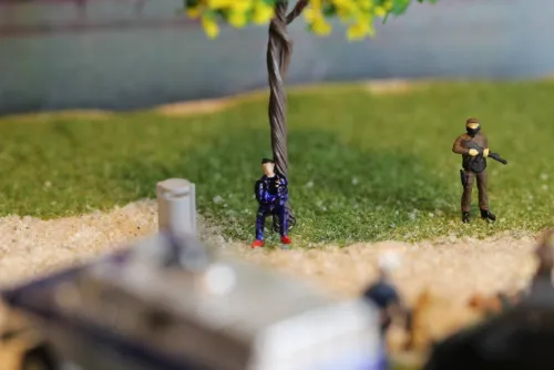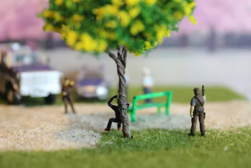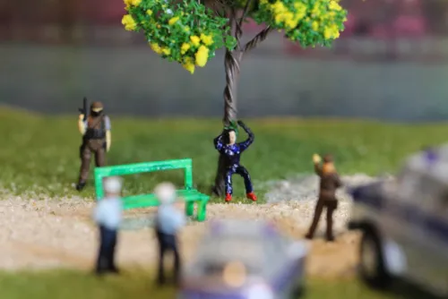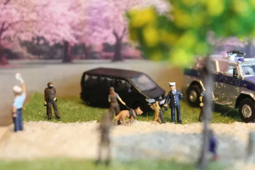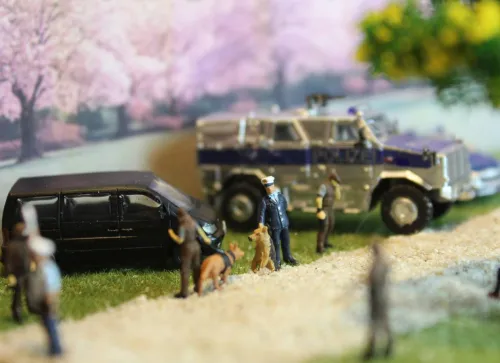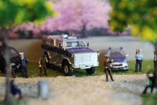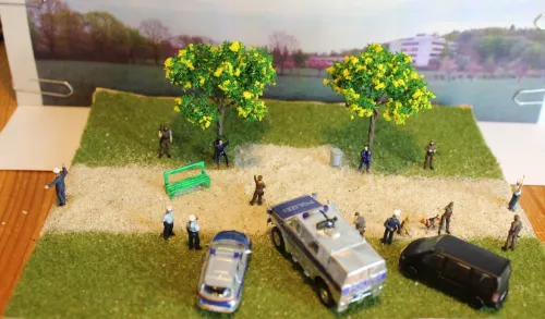 Das liegt an PM Müller und PM Meier, die mit vollem Einsatz das Areal absperren. Spätestens seit PM Müller "versehentlich" das iPhone 16 eines Gaffers zertreten hat, haben sich die Schaulustigen hinter die Absperrung jenseits der Grenzen des Dioramachens zurückgezogen.
