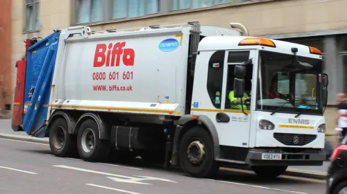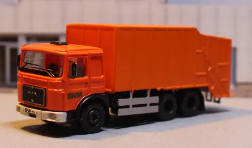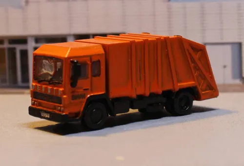 In N hat Arch Laser ein wesentlich größeres Angebot. Ich nehme an, dass die jetzt schon vorhandenen TT-Fahrzeuge einfach hochskaliert wurden. unter anderem haben sie in N auch den Dennis Eagle Elite, einen modernen Müllwagen. Der wird tatsächlich im Original auch mit dem Lenkrad auf der linken Seite in Europa verkauft, und bei den volkstümlichen Preisen, die Arch Laser aufruft, könnte ich mir eine kleine Flotte von den Dingern als Ablösung für die alten vorstellen. So sieht er im Original aus: