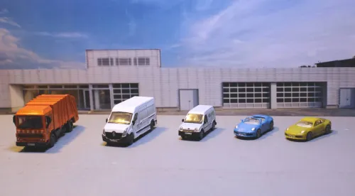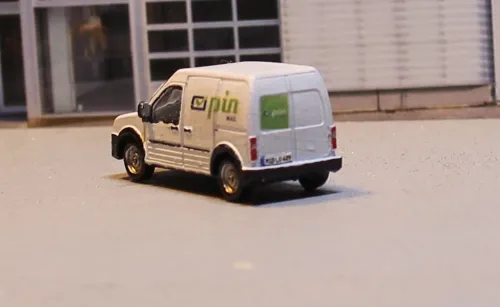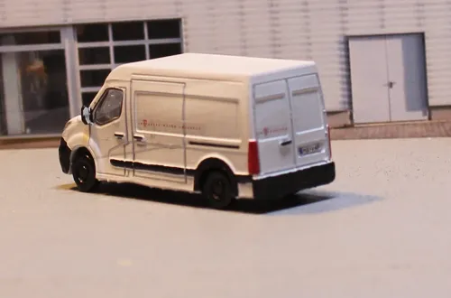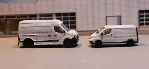 Zwei der Fahrzeuge haben noch einen Partner aus dem Bestand erhalten. Da der Master bei der Telekom einrücken musste, habe ich dem bereits vorhandenen Fertigmodell des Renault Trafic von 3D-Modellbau Löser auch die Telekom-Decals und Kennzeichen spendiert.
