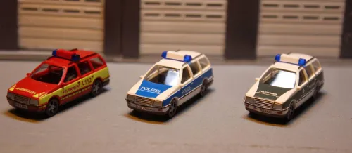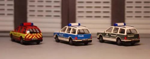 Rückspiegel silbern gefärbt, Frontschürze in Wagenfarbe, Rückleuchten und Blinker vorn rot, Dachreeling, Türgriffe, Rammschutzleisten schwarz. Räder und Stoßfänger schwarz eingefärbt, da der Spritzling dunkelgrau ist, Felgenstern silber. Mittelteil des Sondersignals am Feuerwehrfahrzeug rot, dann noch Kennzeichen, und zwar stilecht Y für den Feldjäger, LSA für das Polizeifahrzeug, das in Sachsen-Anhalt Dienst tut, MID für Middelstedt für das Feuerwehrfahrzeug. Und so sehen sie jetzt aus: