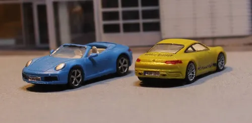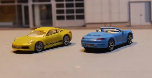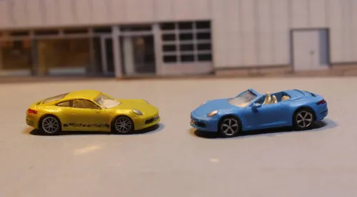 Die beiden Porsche 911 gehören zur Baureihe 991 und sollen das Baujahr 2019 darstellen. Hersteller ist Minichamps. Der macht seine 3D-Druck-Modelle sogar dreiteilig. Es gibt das Coupé und das Cabriolet: