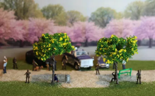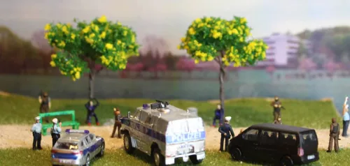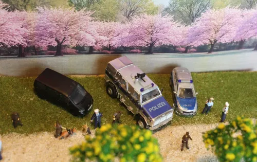 Die Autos sind von Panzer-Shop.nl , und zwar ein Skoda Octavia, ein Dingo 2, der in Ermangelung eines Survivors als Sonderwagen herhalten musste, sowie ein MB Vito, mit dem das SEK (Motto: Wir machen auch Hausbesuche) angereist ist. Der Octavia und der Dingo haben selbst gestaltete Decals und ebenfalls selbst gestaltete Sondersignale erhalten, alle drei Autos darüber hinaus Kennzeichen. Die Polizisten sind alle von Noch, und zwar aus den Sets 45079 "Polizei Sondereinsatzkommando" und 45091 "Polizisten". Die Räuber waren unbemalte Preiser-Figuren in sitzender Haltung. Beiden musste ich die Arme brechen. Einer hat sie in anderer Körperhaltung zurückbekommen, damit es aussieht, als ob er die Hände hochnimmt, dem anderen habe ich auf dem Rücken mit Vallejo Plastic Putty neue Arme gemacht, um den Eindruck zu erwecken, dass er gefesselt ist. Die Bäume waren als Deko bei Modellautos dabei, die ich in Hongkong gekauft hatte, die Bank ist noch von VERO, der Mülleimer ein eigener 3D-Druck. Gras ist von Woodland Scenic, der Weg besteht aus Vogelsand. Unterlage war ein Stück Verpackungspappe.