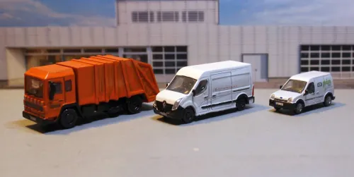 Es handelt sich im Einzelnen um einen Dennis Delta, einen Renault Master und einen Ford Transit Connect. Die Teile waren sauber gedruckt und zweiteilig, was Lackieren und Scheiben einfügen erleichtert:
