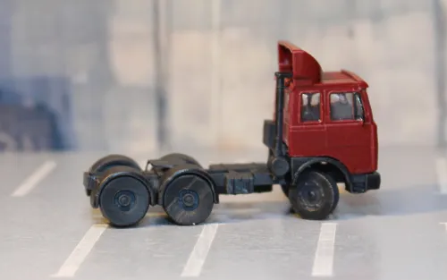 Nachtrag zum Thema MAZ: Da ich nun schon einmal dabei war, habe ich den Dreiachser MAZ 6422 auch gleich gebaut. Und Toni, der gedruckt hat, hatte selbst (Was für ein Zufall!) die Kabine der gefacelifteten Variante von Anfang der 90er Jahre in H0 modelliert und hat sie auf TT herunterskaliert. Sie passte auf Anhieb auf mein Fahrgestell. Und dann hatte ich noch den Vorgänger von Studio Ali da, und der bekam Decals, Kennzeichen und Rückspiegel. Somit gibt es jetzt hier drei Generationen MAZ: