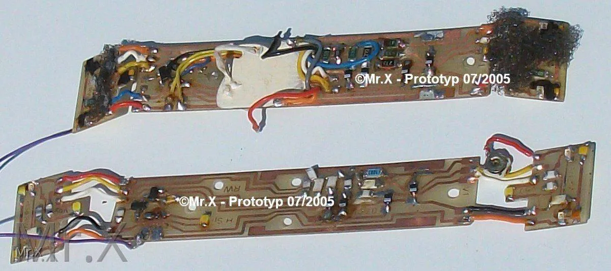 Auch musste die komplette Platine umgestrickt werden, an FlexDec war damals noch nicht zu denken. Der Decoderausschnitt wurde vergrößert und ein ZIMO MX63 darin versenkt. Im Steuerwagen erledigt dies ein simpler Eigenbaufunktionsdecoder.