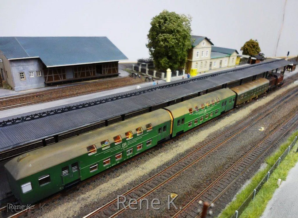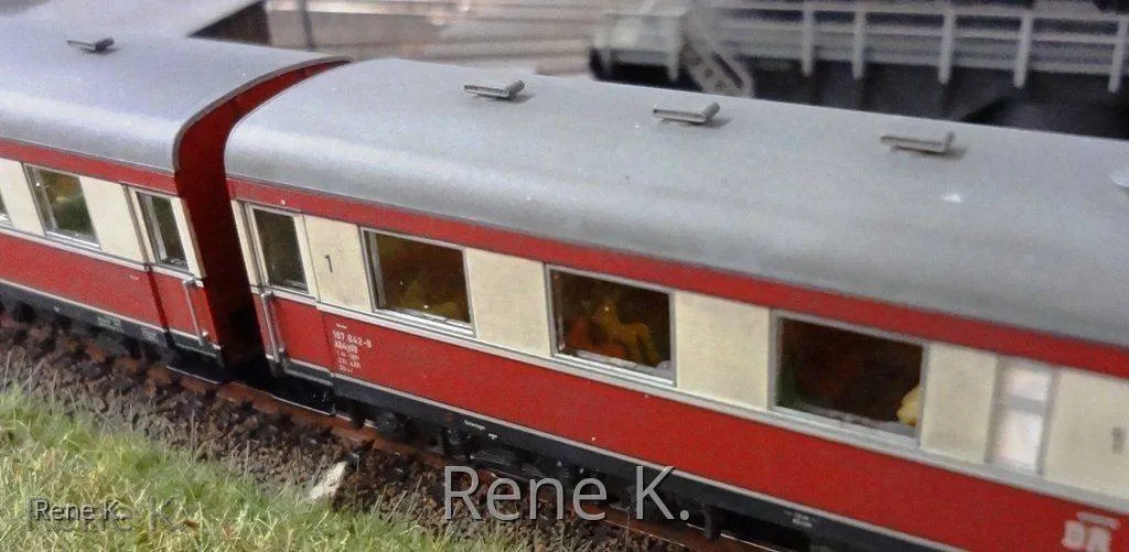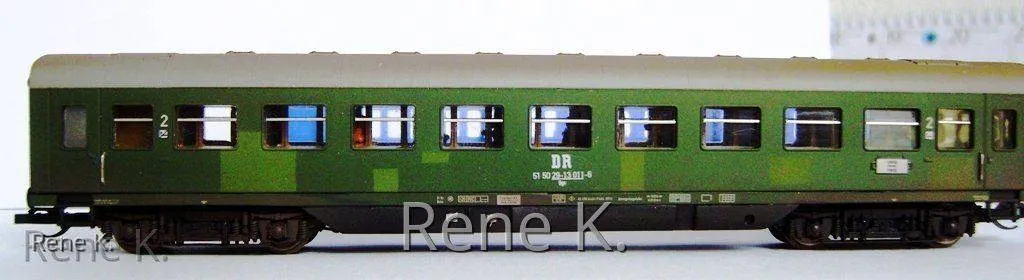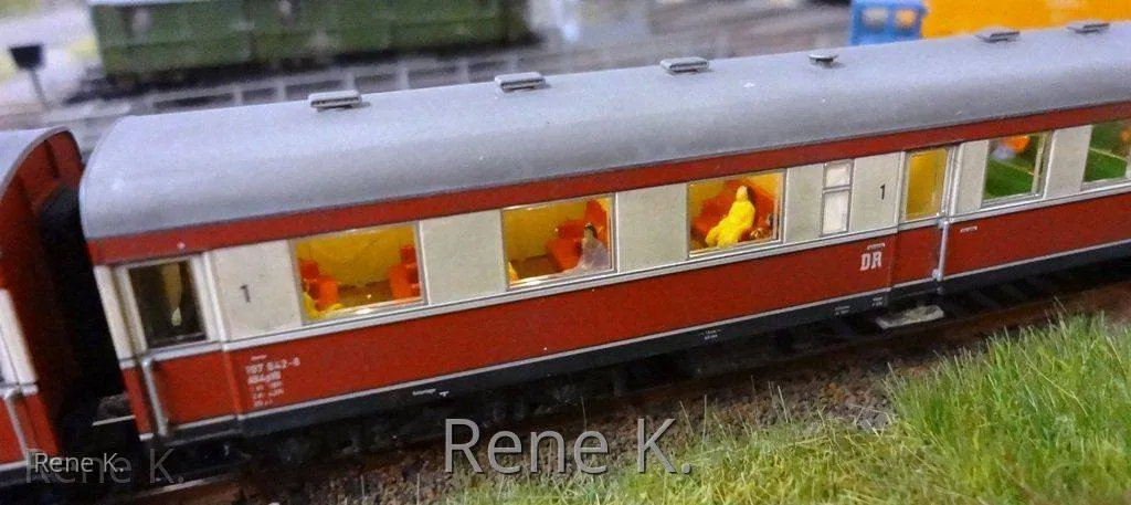 Das Fahrzeug habe ich komplett zerlegt und dann die Scheiben herausgenommen und den Wagenkasten gealtert, dabei habe ich verschiedene Techniken angewand.Nachdem ich soweit war habe ich die Inneneinrichtung Farblich nachgestaltet und die Beleuchtung eingebaut. Die Beleuchtung ist von Roland Weber " http://www.Mobalicht.de " bei der gelegenheit habe ich das mittlere Drehgestell zur Stromabnahme mit herangezogen.