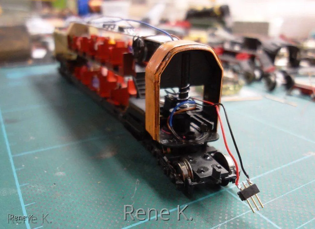 Was habe ich da gemacht : ich habe in das Drehgestell Peho - Buchsen mit einem Draht eingesetzt und dann mit den Platinen in jedem Wagenkasten verbunden.Damit ich dem Wagen noch trennen kann habe ich eine elektrische Kupplung eigebaut mittels eines Steckers, die Buchse sitzt auf der Kupplungsaufnahme.