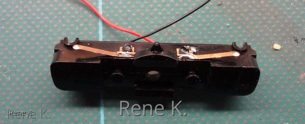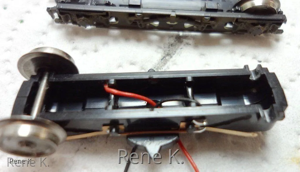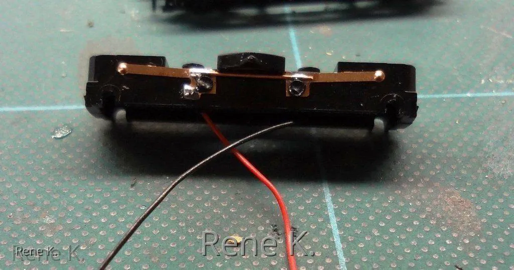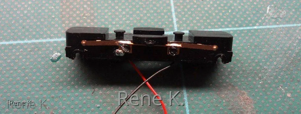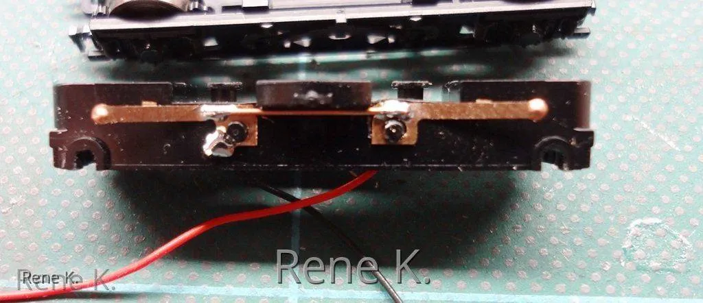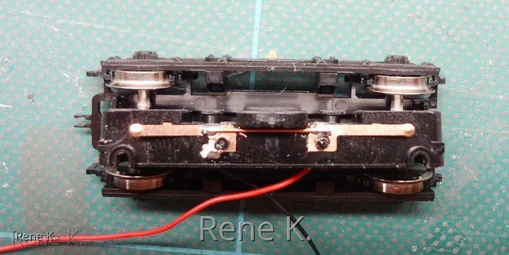 Bei den Zwischenwagen , der von seitens des Herstellers keinen Stromabnehmer hat, habe ich die Stromabnahme analog wie beim VT 18.16 gemacht, und zwar im Drehgestellrahmen von der Achse jeweils einmal links und einmal rechts um den Bremmswiderstand der Radschleifer zu minimieren.