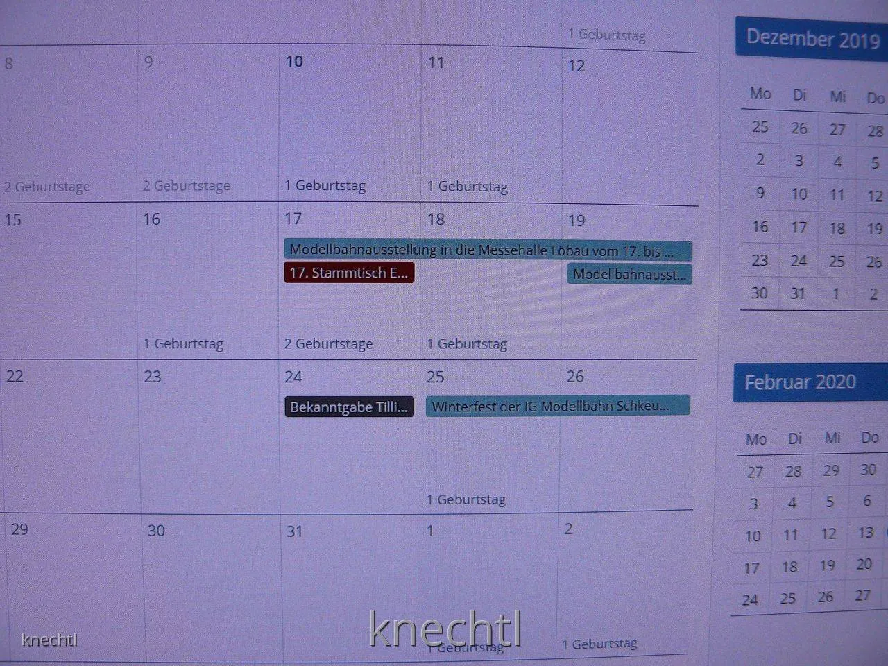 Alle Termine der Stammtische Zwickau und Erzgebirge sind eingetragen, sowie die Termine der Kleinserienmesse im April in der ENSO-Dresden, die Modellbahnausstellungen in der Messe Dresden im Februar sowie in der Messe Löbau im Januar.