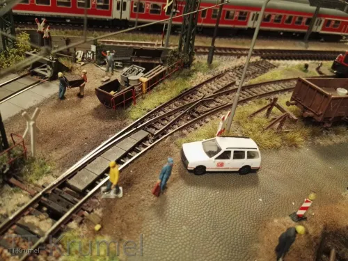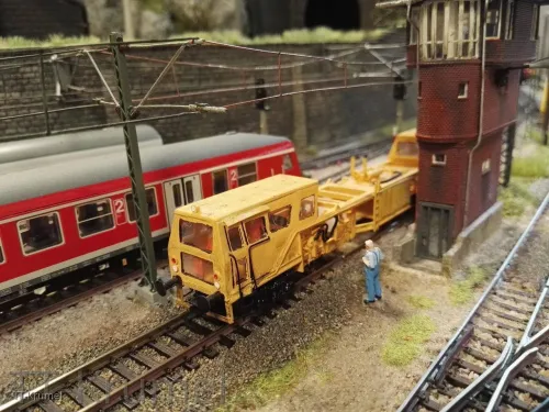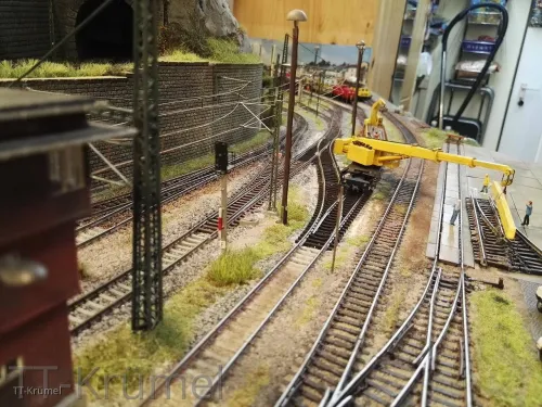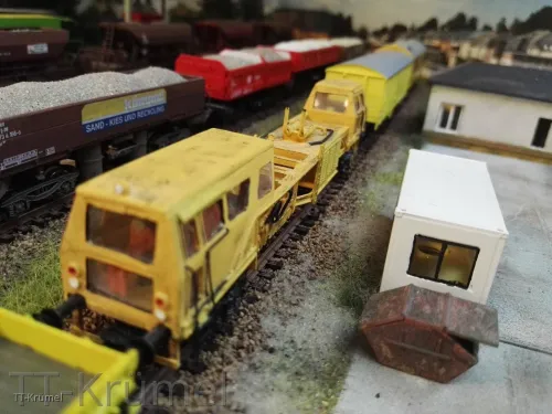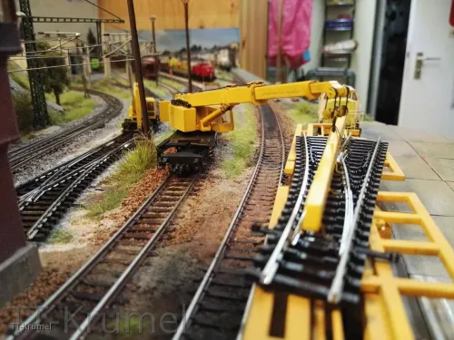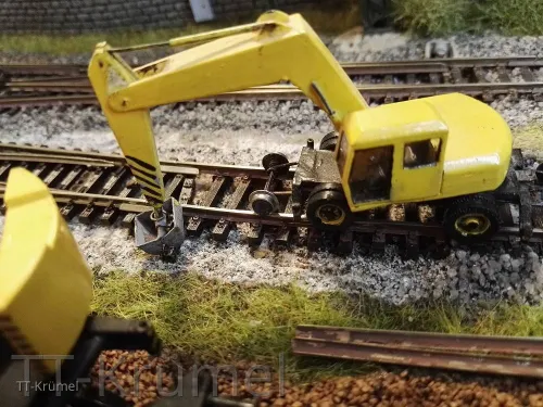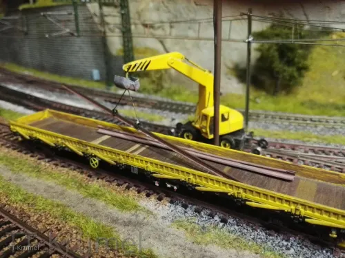 Der Wagen und alle Baumaschinen sind wie sollt es anders sein eine Eigenkreation von mir ,gebaut nach Fotos und wenn ich hatte einigen Maßen. Der Weichenwagen war eine Herausforderung. Der soll ja auch laufen und sich etwas bewegen daran.Ist auch noch nicht zu 100% fertig!!