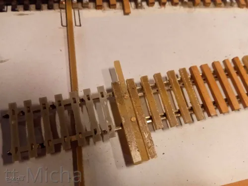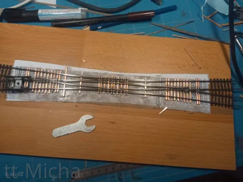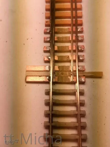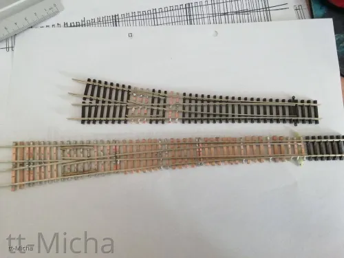 Ich habe Mal ein Foto zum Vergleich mit einer EW3 Weiche gemacht und das andere zeigt die derzeitige Fertigung. Die beiden anderen Fotos zeigen meine Lösung für die Verbindung der Weichenzungen mit der Stellschwelle.