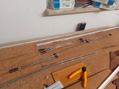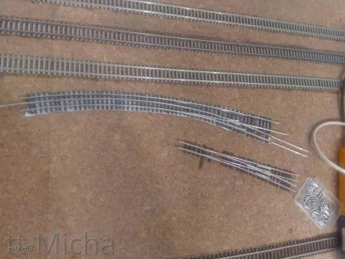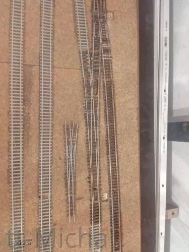 Diesmal wurden Weichen mit 300er Radius gebaut für eine Zweiggleisgeschwindigkeit von 50kmh ,unter anderen habe ich auch die EW3 Weiche umgebaut damit sich die Polarisierung leichter machen lässt . Die kleine Weiche im Hintergrund des ersten Fotos ist eine EW2 Weiche sie ursprünglich als Schutzweiche dienen wird aber wahrscheinlich noch für etwas größeres ersetzt . Ich freue mich schon darauf wenn dann endlich Züge drüber rollen .