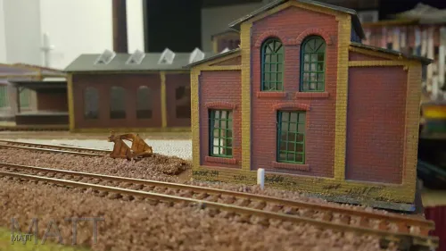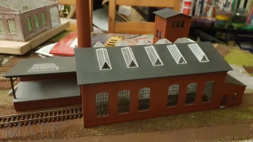 Zum Einsatz kommt ein Eigenbau aus Pappe, ein selbst geschnitzter Kleinlokschuppen ,die Auhagen Fabrik und ein aus dem Ringlokschuppen umgebautes Gebäude.