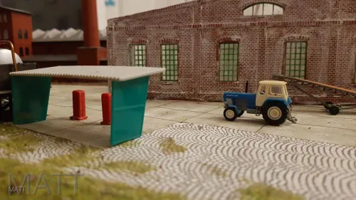 Vorallem bietet das Thema vielfältige Variation. Einmal montiert das Werk Hacksler, dann wieder Mähdräscher, dann wieder Bauteile in Kisten, dann wieder Hänger und und und. Dank der Sets von Tillig u.a. kann man zeigen wie Fahrzeuge angeliefert werden....also da geht viel, wenn man sich damit beschäftigt.