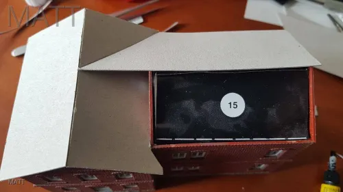 Auch das Dach wurde zunächst einmal aus Pappe dem geänderten Grundriss angepasst.