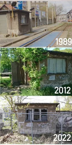 Mai 2022 - die Trasse ist nicht mehr wahrnehmbar, Gebäudeteile und Mauerwerk sind verfallen, baufällig , Grafittibeschmierung, wo man hinseiht, die Natur hat angefangen, den Bewuchs vollflächig auszufächern, auf der Trasse wachsen sogar schon Bäume nach, dazwischen Reste von Grillpartys , Hausrat und anderem Sondermüll...
