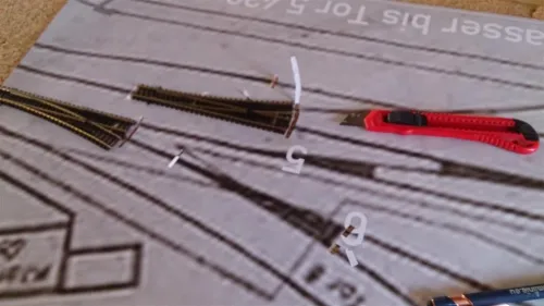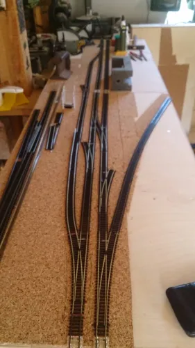 Stand Freitag sind einige schwiereige Teilstücke der Gleisanlage verlegt und eine Schotterhilfe wartet auf Ihren Einsatz. Verbaut wird Tillig Modellgleis, EW2 und EW 3, es gilt 2 Kreuzungnen selbst zu bauen. Gefahren wird Digital, die Weichen werden mechanisch geschaltet.