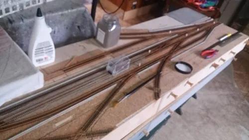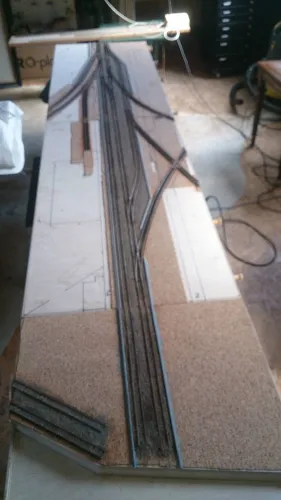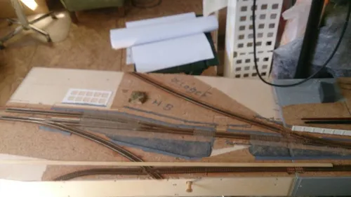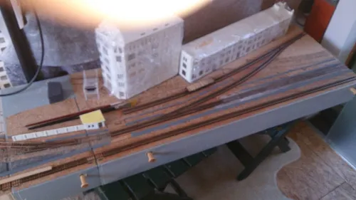 Es geht jetzt kontinuierlich voran. Gleis wurde weiter für die folgenden Module verlegt. Aus dem alten Auftrag haben wir das wabbelige Fiddleyard gefleddert, um eines der Module zu verlängern. Alles was vom alten Auftrag noch brauchbar war, habe ich erneut gesichtet und für das Modul Rechenzentrum Hallenblock haben wir erste Stellproben realisiert.
