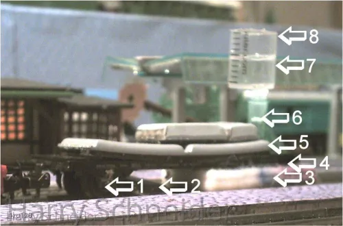 Den Spritzenkörper so lange mit Spiritus füllen, bis der Filz darunter „naß“ ist. Anschließend das gesamte „Gefährt“ unter leichtem Druck auf einem geraden Stück Gleis einige Male hin- und herschieben (dadurch bilden sich im Filz Rillen entsprechend dem Gleis – dienen zur Führung des Wagens).