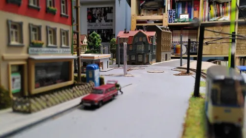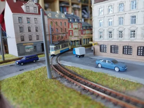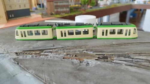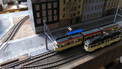 Hier ein Treffen von Trambahnen die sich im Original nie auf einem Gleis hätten treffen können :