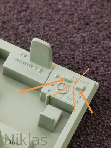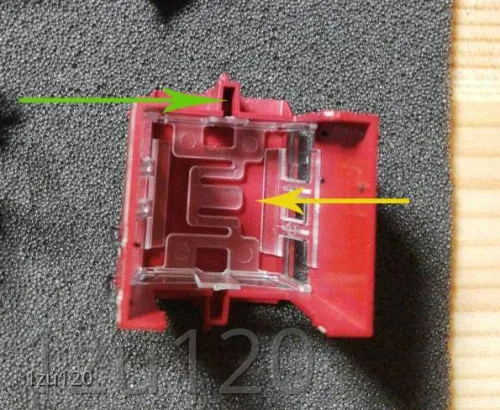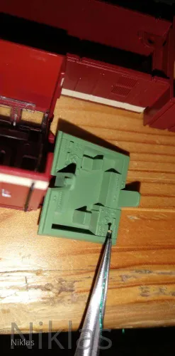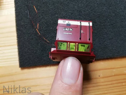 Die Beleuchtung hatte ich bei einer ins Dach eingeklebt, gelbe Kennzeichnung. Die Zuleitung über 2 Kupferlackdrähte durch den Vorbau des Führerstandes, grüne Kennzeichnung.