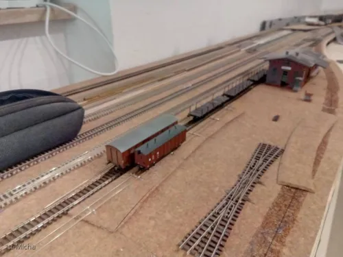Da eine Bahnstrecke erst zur Bahnstrecke wird wenn von A nach B gefahren werden kann ,habe ich nun den 2. Endbahnhof meiner Bimmelbahn angefangen ,dieser wird auf der anderen Seite meiner Anlage über die Gleiswendel platziert .Somit ergibt sich eine Streckenlänge von fast 10 m .