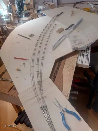 Naja,ich denke fertig dauert schon noch ne gaaaanze Weile ,es sind ja auch noch Streckengleise zu verlegen und im Spurwechsel Bahnhof auf der anderen Seite bin ich noch in der Planungsphase ,da es dafür auf Grund der schon verlegten Regelspur kein konkretes Vorbild gibt und ich die Schmalspur an die vorhanden Gegebenheiten anpassen mus.