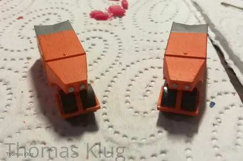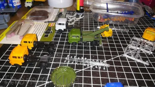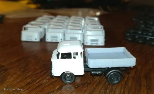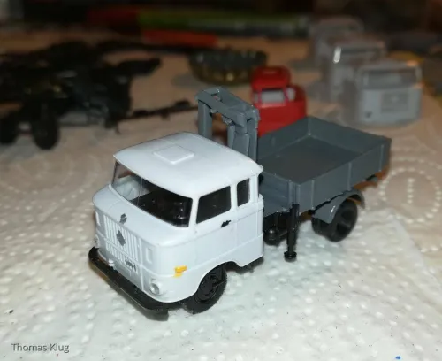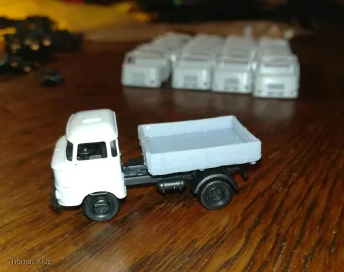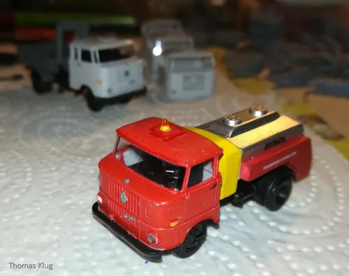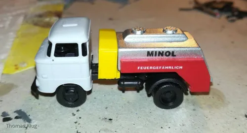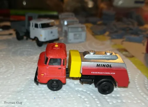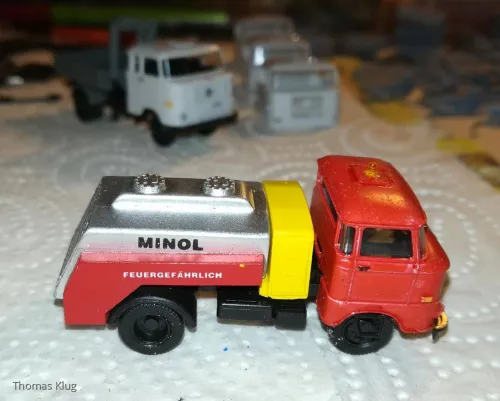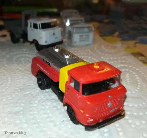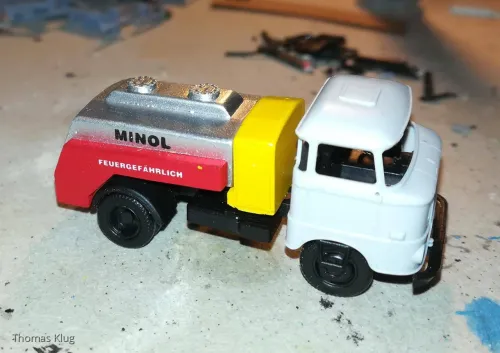 Ein W-50 Minoltanker von Peter Lorenz wurde seines Aufbaus (Armaturenschrank und Tank) beraubt und ein Fahrwerk von Ralf Hadler (Hädl Manufaktur) der kurzen Sattelzug Maschine darunter gesetzt, einschließlich der Fahrer Kabine. Nun noch bissel Farbe und die Scheiben rein und fertsch...