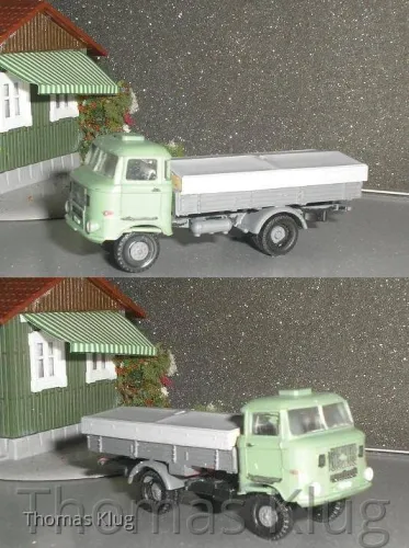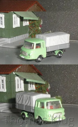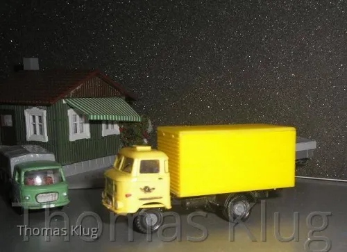 ich habe heute wieder etwas gebastelt, diesmal wieder für die Strasse, einen Barkas B1000 Pritsche mit und ohne Plane, dieser ist endstanden aus einem Bausatz von Jano, einen W50 Deutsche Post Koffer und einen W50 mit Pritsche und Flachplane, diese Beiden sind aus der so berühmten Basteltüte von s.e.s..