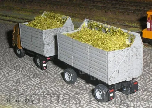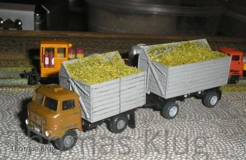 ich habe in der vorweihnachtlichen Zeit wieder etwas gebastelt, bzw. einige Fahrzeuge mit Ladegut versehen, als erstes haben mein W50 mit Schwerhäckselaufbau und sein Anhänger HW80 eine Ladung Häckselgut erhalten (hier soll es Maishäcksel sein), deshalb ist das Häckselgut auch so grob.