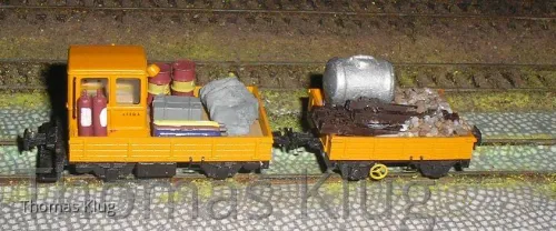 ...nun möchte ich Euch die Bilder von meinem SKL, den ich nun auch ausgerüstet habe, nicht vorenthalten, der Motorwagen hat als Ausrüstung 2 Propangasflaschen, eine Europalette mit 2 Fässern Diesel oder Öl , eine Europalette mit 3 Gasflaschen Acethon, sauerstoff und Stickstoff, eine Werkzeugkiste und einige Ersatzteile unter einer Plane erhalten. Der Rollwagen wurde mit einem Aufsetztank für Wasser, einigen Schwellen und Schotter beladen, so nun kann er auf Inspektionsfahrt und zur Reparatur, Wartung und Pflege der Signal-, und Gleisanlagen ausrücken....