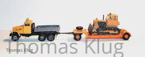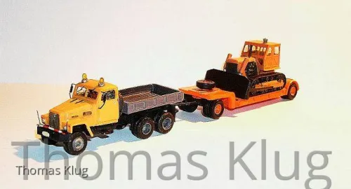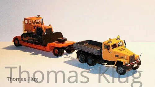 Der G-5 darf nun das Gespann mit dem Tiefladeanhänger und der T-100 Raupe ziehen...