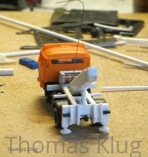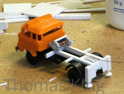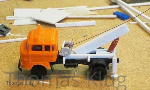 Als Basis dient ein ein Allrader mit 1,1/2 Kabine von Hädl´s Manufaktur. Auf diesen wird in mühevoller Kleinarbeit der gesamte Aufbau aus Polystyrol Profilen gebaut, aber noch nicht verklebt.