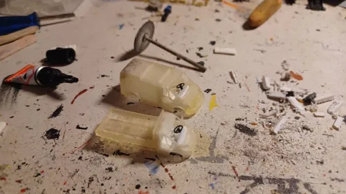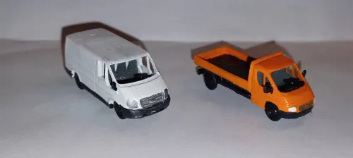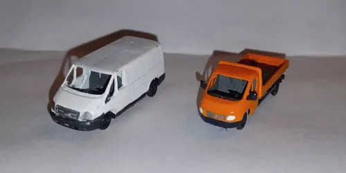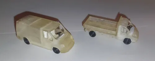Es ist ein Ford Transit Kastenwagen und eine Fiat Ducato Pritsche, welche derzeit in der Endmontage aus 3D-Druck Gehäuse entstehen.