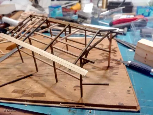 Dazu habe ich aus vorhandenen Holzleisten und Furnier was noch Dank meines verstorbenen Schwiegervaters reichlich vorhanden ist diesen Schuppen gebastelt .