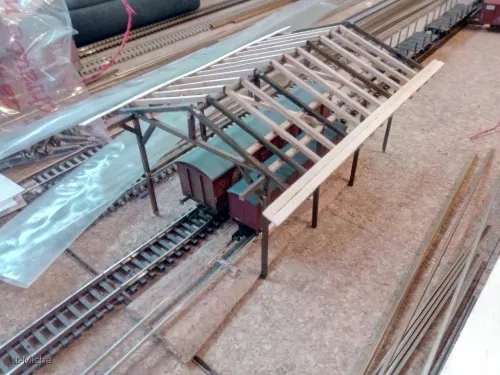 Und schon bald sind die Dachdecker fertig ,der Teer auf der Pappe ist noch nicht ganz trocken und die Gleise müssen fertig verlegt werden .![]()