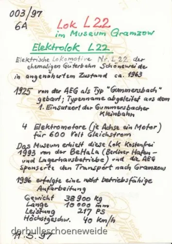 Das Vorbild meiner Lok AEG L22 wurde 1925 in Dienst gestellt und tat den Dienst auf der Industriebahn in Schöneweide bis 1988.