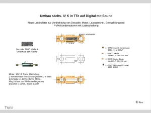 • Wenn ich das so verfolge, dann ist ein Einbau eines Sounddecoder eher etwas für diejenigen, die schon von Anfang an, den Bausatz der IVK bauen. Da kann dann während des Bauens geschaut werden, wie und wo man den Decoder am besten einbauen könnte.