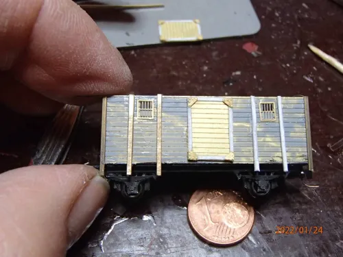 Und die Winkel an den Ecken des Wagenkastens sehen mal wieder im Makro brutal aus, sind aber 1 x 1 mm und damit genausogroß wie an meinen anderen Wagen. Damit bleibt das Gesamtbild im Zugverband für mich stimmig. Ich klebe die Winkel immer erst mal an, um sie dann auf Länge abzuflexen.