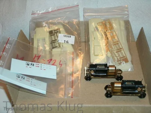 2 Bausätze eines M 124 "Komarek" Dampftriebwagen fanden auch den Weg zu mir. Das Modell wird in Mischbauweise zusammengebaut, das heißt: der Rahmen, das Dach und einige Anbauteile sind aus Resin, die Steuerung und der Wagenkasten sind geätzt und die Fahrwerke sind bereits komplettiert und zusammengebaut.