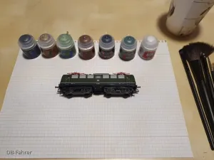 Das ganze gibt es als Beispiel an einem Modell der BR140 der DB von Kuehn-Modell in TT. Als Werkzeug bzw. Farben diente folgendes: